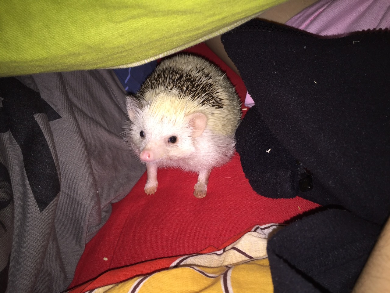 Pinky Mei, jak jsem samičku pojmenovala, se k nám přišla v lednu letošního roku. To byla ještě malý ježeček, teď je to naše nejmladší největší samička. Má velice přátelskou a mazlivou povahu. Je to objevitelka. Dokáže několik hodin běhat po bytě a neunavit se. Přestože jsem o tom dlouho nevěděla, je s Caty příbuzná :)